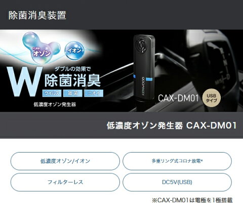 ケンウッド USBタイプ低濃度オゾン発生器 CAX-DM01 コンパクト 小型 車内 USB対応 オゾン脱臭機 ダブル除菌 消臭 携帯 ウイルス対策 フィルターレス 空気清浄機 KENWOOD おすすめのポイント オゾンとイオンのW効果でウイルス・ニオイを元から除菌・消臭! 多重リング式コロナ放電の強力パワーで車内が快適な空間に。