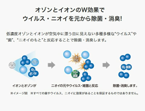 低濃度オゾンとイオンでダブル除菌消臭! 多種多様なウイルスや菌、ニオイのもとを除菌・消臭。