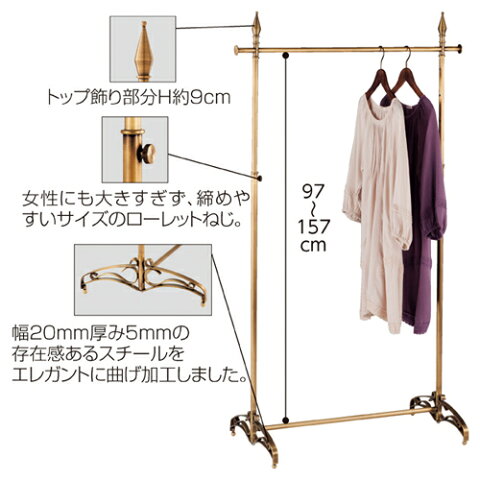 商品の仕様●サイズ:W90×D46×H124.5〜184.5cm●バー内寸:W72.5cm ハンガーパイプ:φ19mm 外パイプ:φ22mm●素材・加工:スチール製 アンティークゴールドメッキ●重量:7.8kg●耐荷重:30kg●組立式●10cm間隔で7段階の高さ調節ができます。