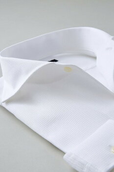 イタリアンカラーと広角なワイドカラーを掛け合わせたスタイリッシュなノーネクタイ専用の衿型です。