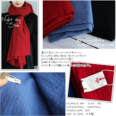 【2022-23年秋冬☆数量限定生産!送料無料!】French Bull/フレンチブルNo.17-03212 ナイトスカイストール2022-23AW(3色)【ウォッシュ加工/ウールガーゼ/今季限定カラー/無地/ショール/羽織/防寒/冷えとり/クーラー冷房対策/日焼け対策】【ウール100%/日本製】