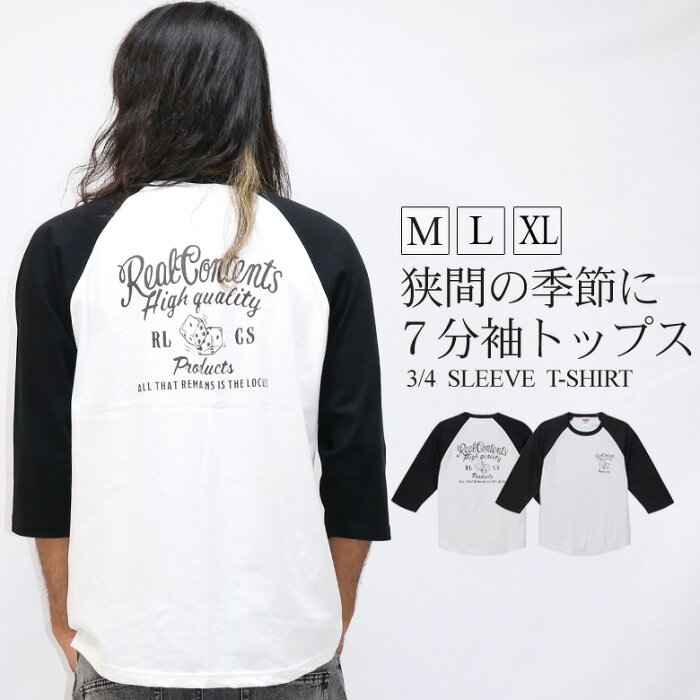 REALCONTENTS Tシャツ ティーシャツ 七分袖 7分袖 半端袖 ラグランスリーブ クルーネック 丸首 切替 トップス カットソー メンズ M L XL 2L LL バックプリント サイコロ柄 ブランド リアルコンテンツ アメカジ ワーク系 厚手 ヘビーウェイト オススメ 白 黒 秋 秋物 新作
