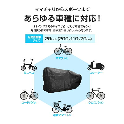 【製品仕様】 材質:300Dオックスフォード+ステンレス製 耐水性:3000mm UPF:50+ 本体寸法:200 × 110 × 70cm 収納袋:36 × 25cm(平置き) 対応サイズ:29インチまで 対応車種:スポーツサイクル / シティサイクル / 折りたたみ自転車 / スクーター / 電動アシスト自転車 【ご使用にあたって】 自転車カバーは消耗品です。